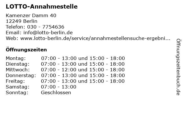 | Öffnungszeiten LOTTO-Annahmestelle in Berlin anzeigen | |
