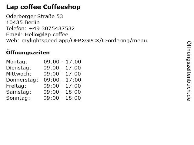 | Öffnungszeiten Lap coffee Coffeeshop in Berlin anzeigen | |