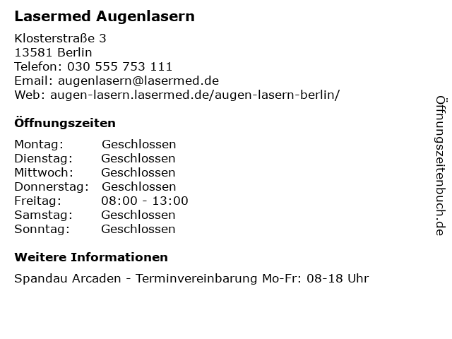 | Öffnungszeiten Lasermed Augenlasern in Berlin anzeigen | |