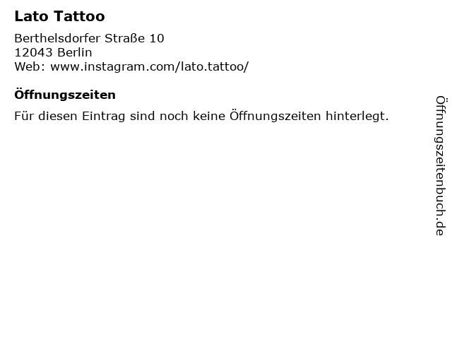 | Öffnungszeiten Lato Tattoo in Berlin anzeigen | |