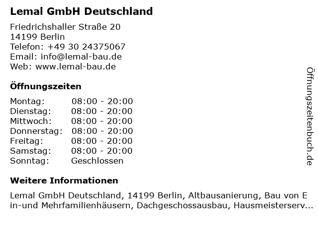 | Öffnungszeiten Lemal GmbH Deutschland in Berlin anzeigen | |