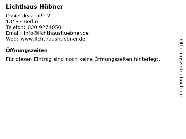 | Öffnungszeiten Lichthaus Hübner in Berlin anzeigen | |