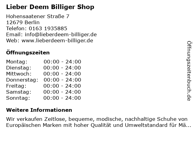 | Öffnungszeiten Lieber Deem Billiger Shop in Berlin anzeigen | |