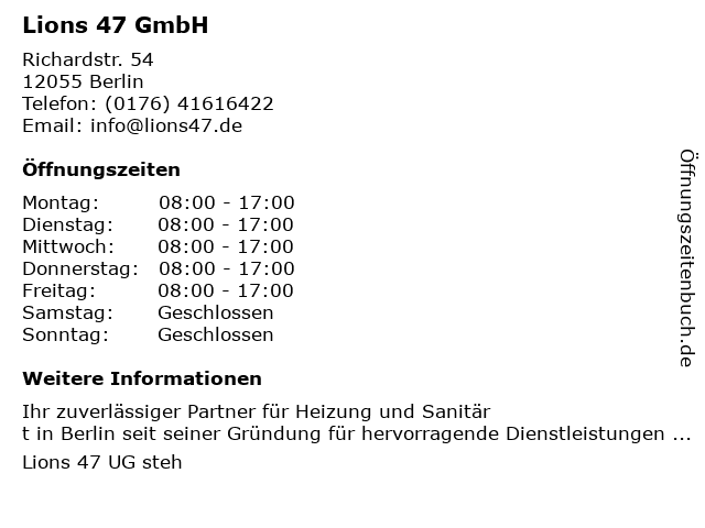 | Öffnungszeiten Lions 47 GmbH in Berlin anzeigen | |