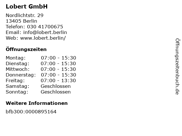 | Öffnungszeiten Lobert GmbH in Berlin anzeigen | |