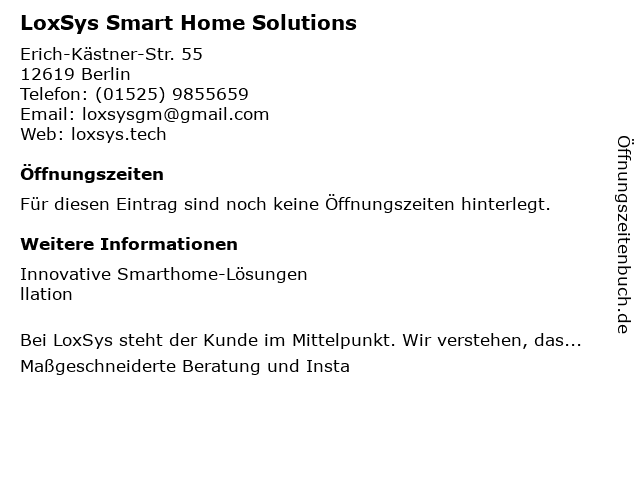 | Öffnungszeiten LoxSys Smart Home Solutions in Berlin anzeigen | |