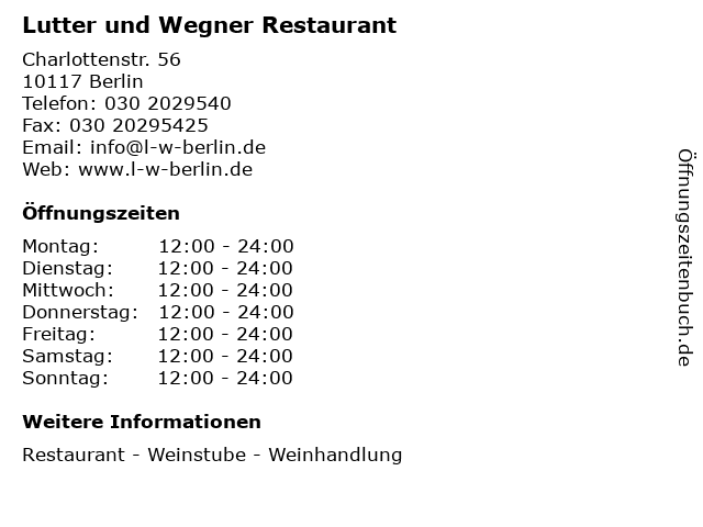 | Öffnungszeiten Lutter und Wegner Restaurant in Berlin anzeigen | |