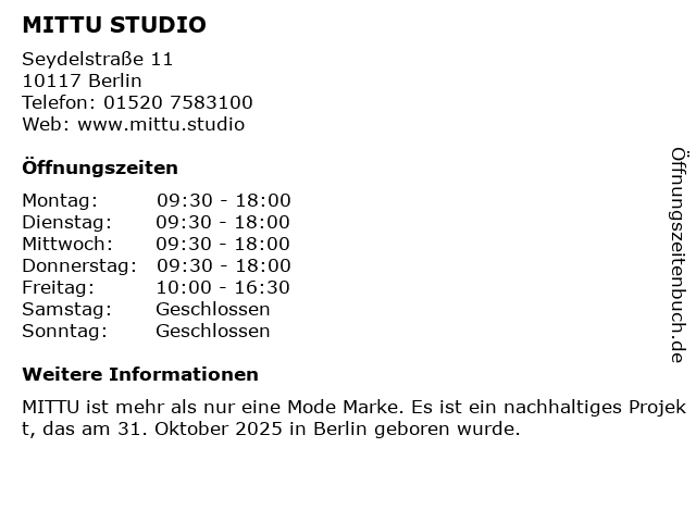 | Öffnungszeiten MITTU STUDIO in Berlin anzeigen | |