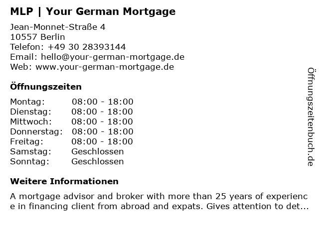 | Öffnungszeiten MLP | Your German Mortgage in Berlin anzeigen | |