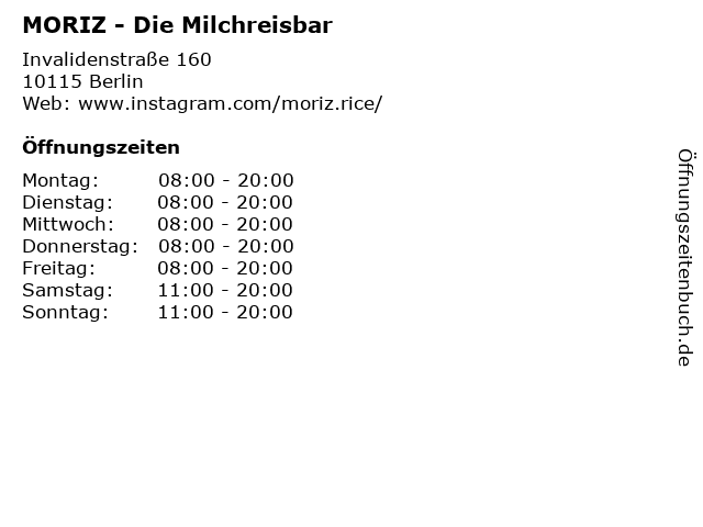 | Öffnungszeiten MORIZ - Die Milchreisbar in Berlin anzeigen | |