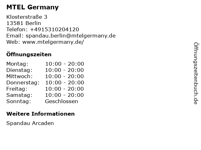 | Öffnungszeiten MTEL Germany in Berlin anzeigen | |