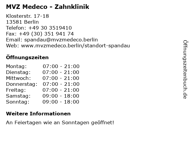 | Öffnungszeiten MVZ Medeco - Zahnklinik in Berlin anzeigen | |