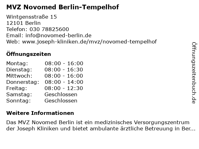 | Öffnungszeiten MVZ Novomed Berlin-Tempelhof in Berlin anzeigen | |