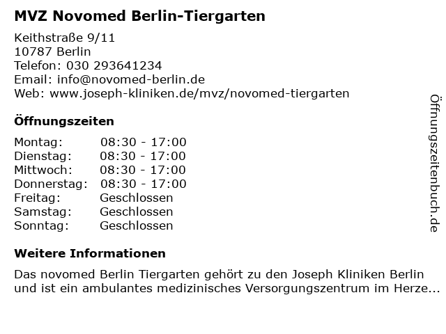 | Öffnungszeiten MVZ Novomed Berlin-Tiergarten in Berlin anzeigen | |