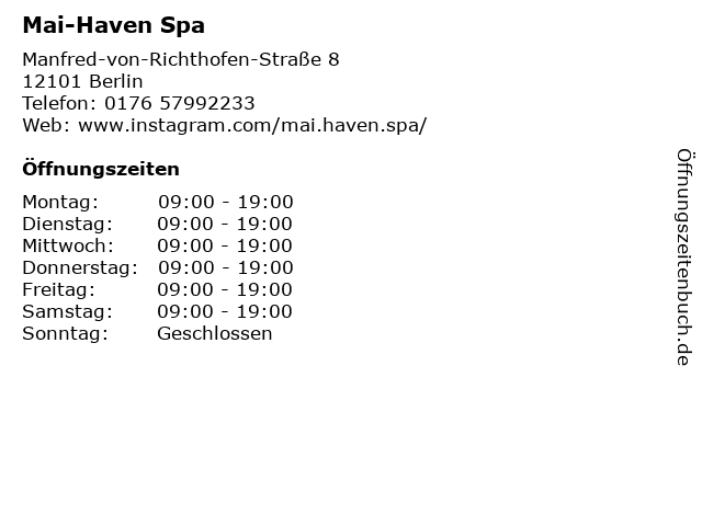 | Öffnungszeiten Mai-Haven Spa in Berlin anzeigen | |