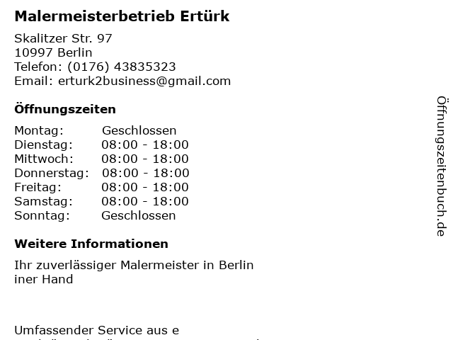 | Öffnungszeiten Malermeisterbetrieb Ertürk in Berlin anzeigen | |