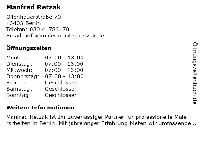 | Öffnungszeiten Manfred Retzak in Berlin anzeigen | |