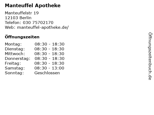 | Öffnungszeiten Manteuffel Apotheke in Berlin anzeigen | |