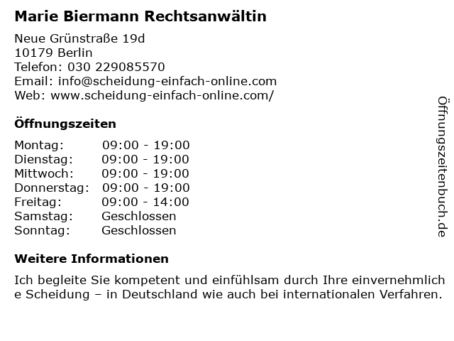 | Öffnungszeiten Marie Biermann Rechtsanwältin in Berlin anzeigen | |