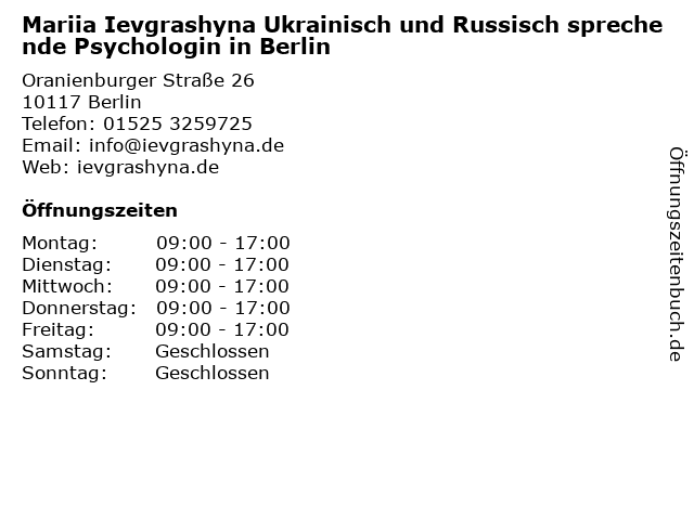 Branchen & Suchbegriffe zu Mariia Ievgrashyna Ukrainisch und Russisch sprechende Psychologin in Berlin:eheberatung, ievgrashyna, mariia, psychoanalyse, psychologin, psychotherapie, russisch, sprechende, ukrainisch, unternehmensberatung |