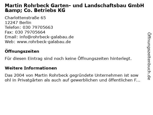 | Martin Rohrbeck Garten- und Landschaftsbau GmbH & Co. Betriebs KG anrufen | |
