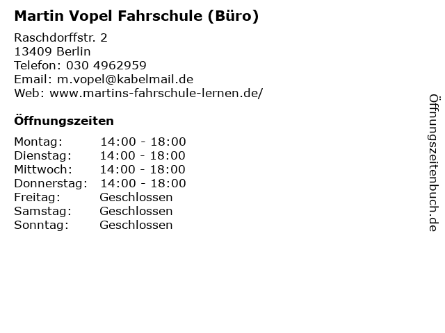 Öffnungszeiten Martin Vopel Fahrschule (Büro) in Berlin anzeigen | |