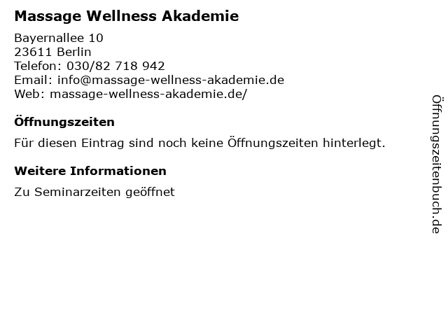 | Öffnungszeiten Massage Wellness Akademie in Berlin anzeigen | |