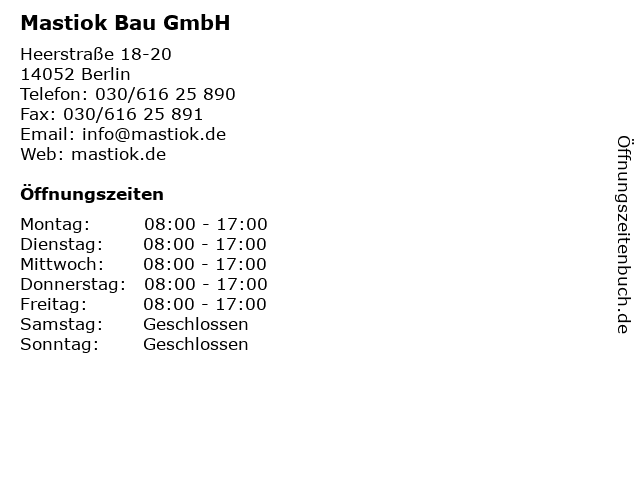 | Öffnungszeiten Mastiok Bau GmbH in Berlin anzeigen | |