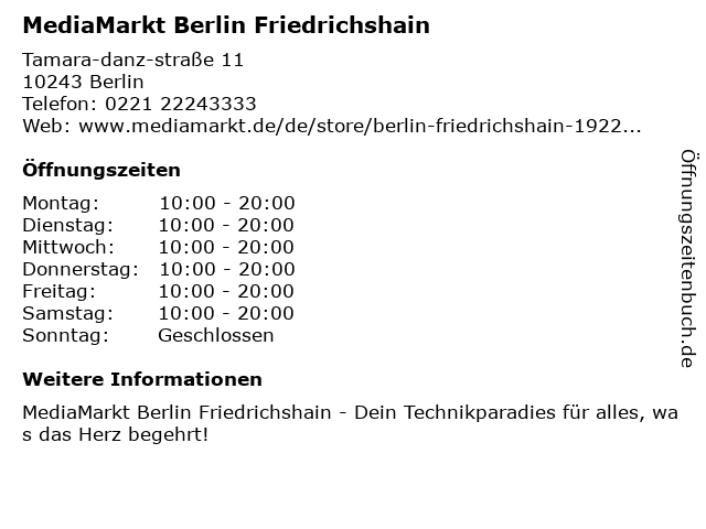 Branchen & Suchbegriffe zu MediaMarkt Berlin Friedrichshain:anbieter für telekommunikationsgeräte, computergeschäft, friedrichshain, geschäft für handyzubehör, geschäft für heimaudiosysteme, geschäft für videospiele, handyreparaturgeschäft, haushaltsgeräte, mediamarkt, mobiltelefongeschäft |