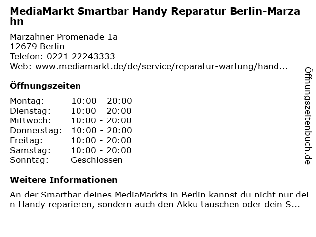 Branchen & Suchbegriffe zu MediaMarkt Smartbar Handy Reparatur Berlin-Marzahn:anbieter für telekommunikationsgeräte, geschäft für handyzubehör, handy, marzahn, mediamarkt, mobiltelefongeschäft, reparatur, smartbar |