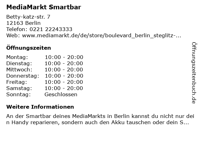 | Öffnungszeiten MediaMarkt Smartbar in Berlin anzeigen | |