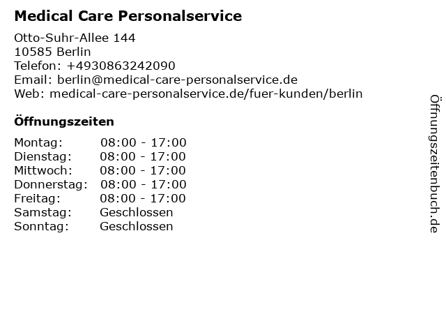 | Öffnungszeiten Medical Care Personalservice in Berlin anzeigen | |