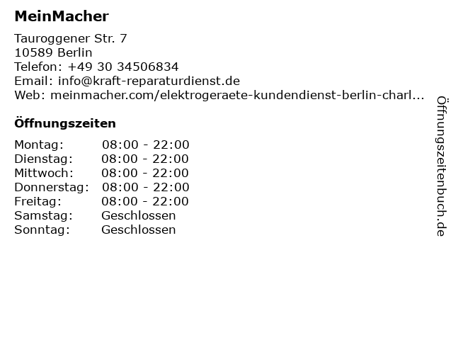 | Öffnungszeiten MeinMacher in Berlin anzeigen | |