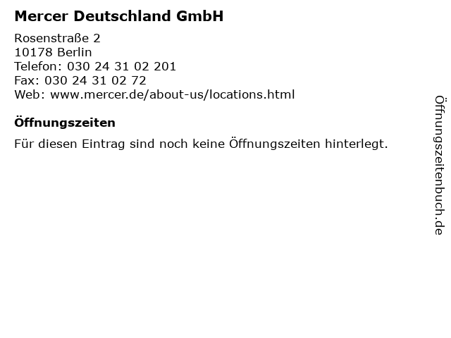 | Öffnungszeiten Mercer Deutschland GmbH in Berlin anzeigen | |