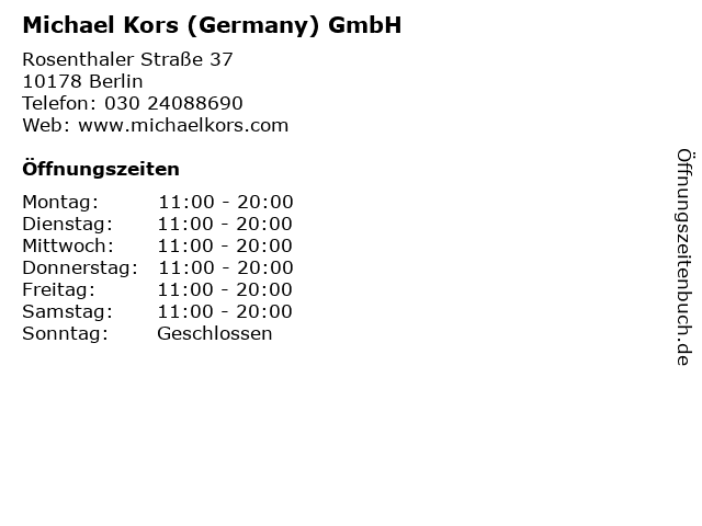 | Öffnungszeiten Michael Kors (Germany) GmbH in Berlin anzeigen | |