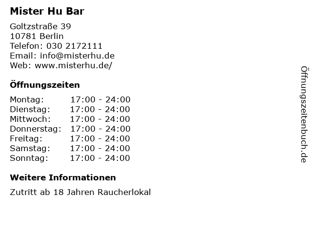| Öffnungszeiten Mister Hu Bar in Berlin anzeigen | |