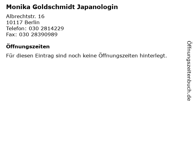 | Öffnungszeiten Monika Goldschmidt Japanologin in Berlin anzeigen | |