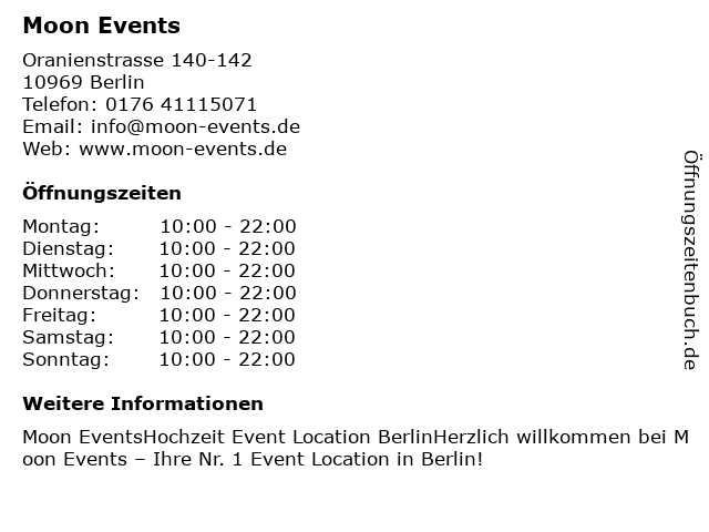 | Öffnungszeiten Moon Events in Berlin anzeigen | |