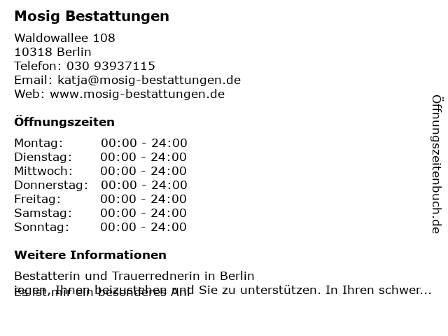 | Öffnungszeiten Mosig Bestattungen in Berlin anzeigen | |