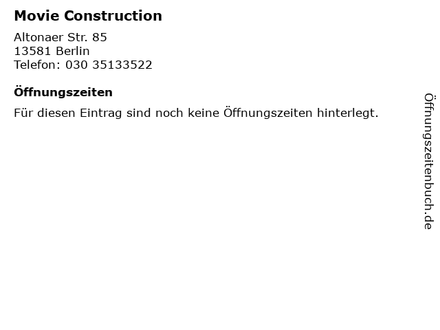 | Öffnungszeiten Movie Construction in Berlin anzeigen | |