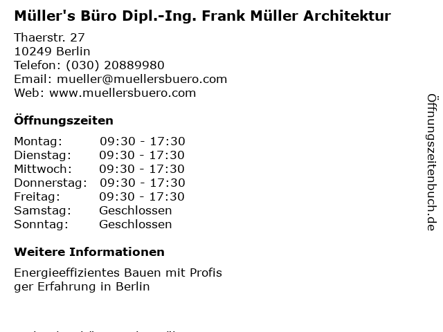 1 Müller's Büro Dipl.-Ing. Frank Müller Architektur (Entfernung: 4,97 km) Dorotheenstr. 90, 10117 Berlin 3 5 Dagmar-Ursula Krischok, Thomas Architektur Bauplanung (Entfernung: 2,51 km) Straße 9 15, 13059 Berlin 6 |