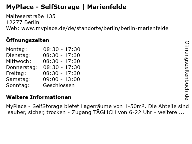 | Öffnungszeiten MyPlace - SelfStorage | Marienfelde in Berlin anzeigen | |