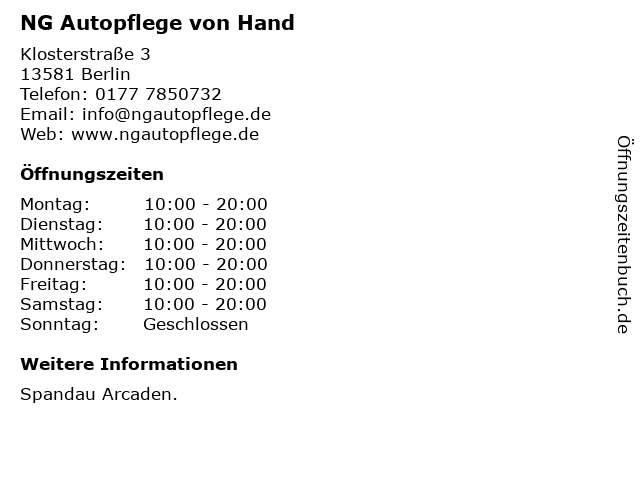 | Öffnungszeiten NG Autopflege von Hand in Berlin anzeigen | |