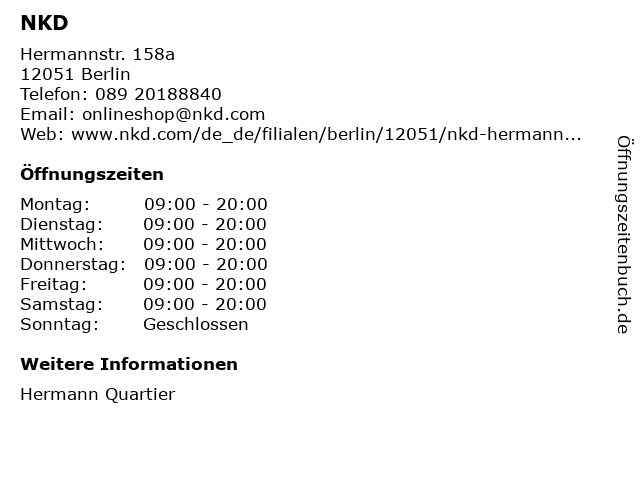| Öffnungszeiten NKD in Berlin anzeigen | |