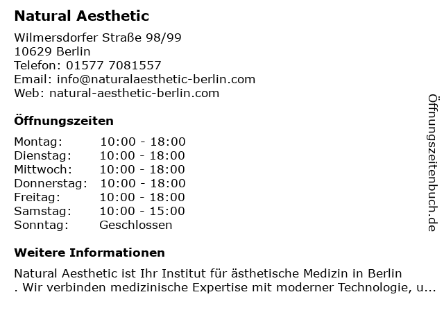 | Öffnungszeiten Natural Aesthetic in Berlin anzeigen | |