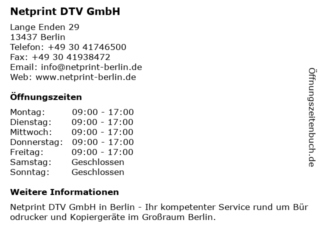 | Öffnungszeiten Netprint DTV GmbH in Berlin anzeigen | |