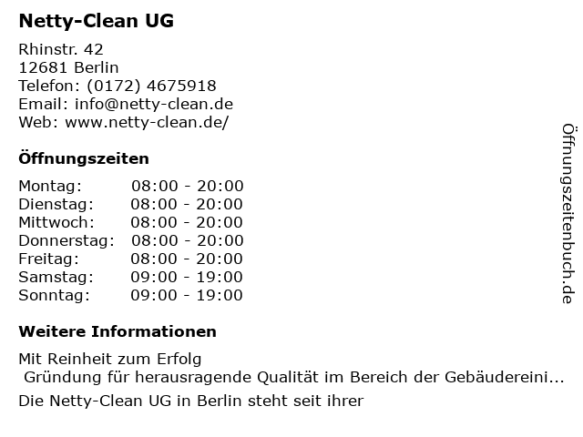 | Öffnungszeiten Netty-Clean UG in Berlin anzeigen | |