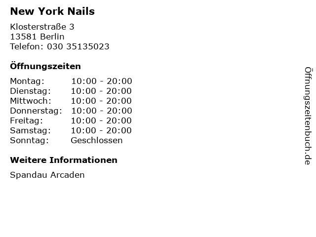 | Öffnungszeiten New York Nails in Berlin anzeigen | |