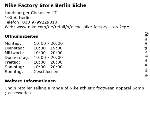 Branchen & Suchbegriffe zu Nike Factory Store Berlin Eiche:eiche, factory, geschäft für damenmode, geschäft für herrenmode, geschäft für kindermode, mode, nike, schuhgeschäft, store |