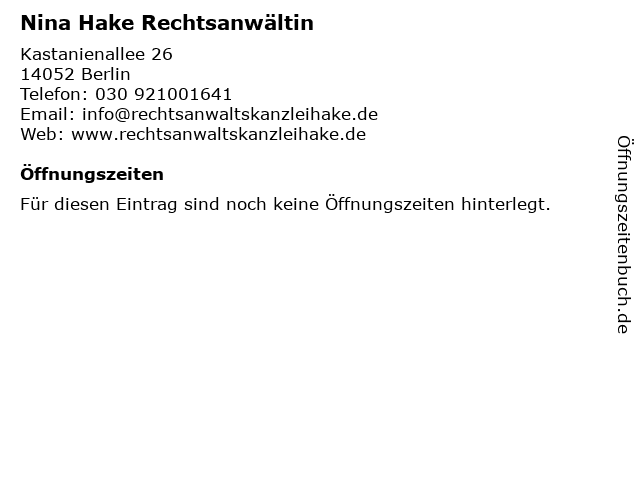 | Öffnungszeiten Nina Hake Rechtsanwältin in Berlin anzeigen | |